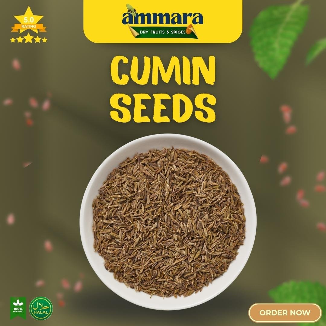 (Caption/Description): Infuse your dishes with the warm, earthy, and aromatic flavour of Ammara Dry Fruits & Spices' Premium White Cumin Seeds!